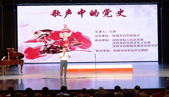 传唱活动由张掖市音乐家协会副主席、河西学院附属实验中学高级教师王勇和张掖市音乐家协会金声合唱团联合讲授。他们用说唱结合、台上台下互动的教学方式,以歌述史,用一首首经典歌曲回顾中国共产党百年风雨,直观形象地通过歌声讲述中国共产党人的机智勇敢和坚韧不拔,用音乐为师生们诠释宏大壮阔的中国革命史诗。带领大家以视、听、唱、悟的形式,唱革命歌曲,听革命故事,学英雄事迹,在党史中传承红色文化、汲取红色营养,感受共产党人的精神力量。